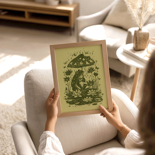 Cottagecore sage green frog with mushroom umbrella and lotus flower printable linocut prints wall art digital poster