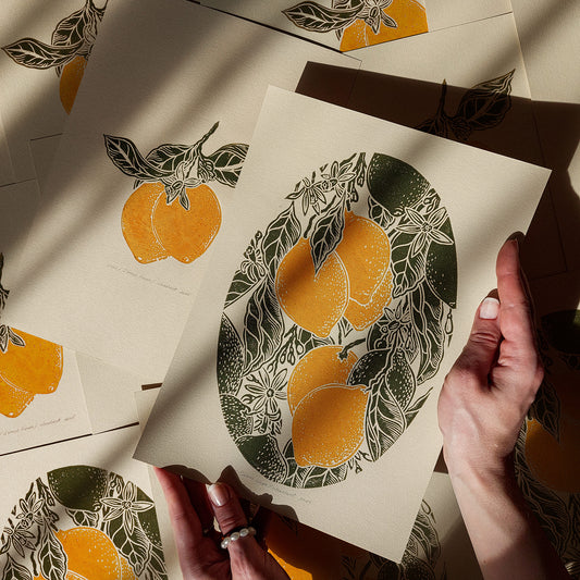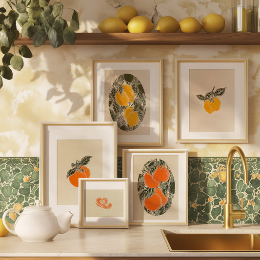 Gallery wall set of 4 Vintage lemon and orange fruits linocut print for Kitchen art decor