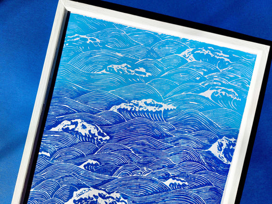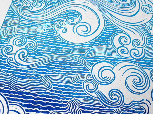 Blue waves Linocut print for Nature lover gift UNFRAMED