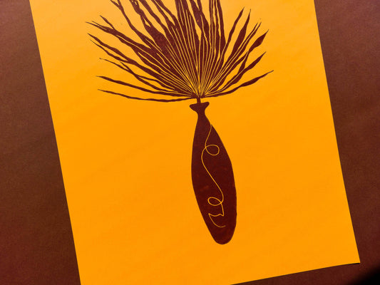Yellow and brown Boho vase and plant art Linocut print for New home gift UNFRAMED