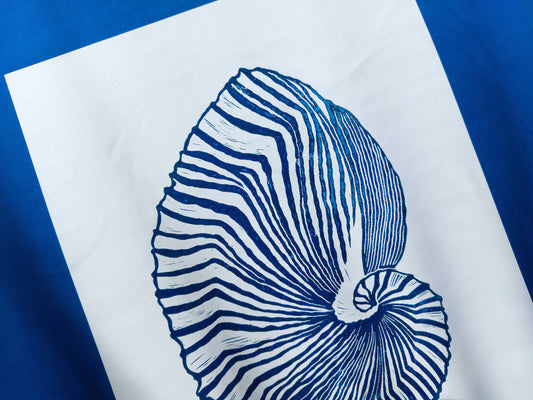 Blue sea shell art Linocut print Hampton style decor for living room UNFRAMED