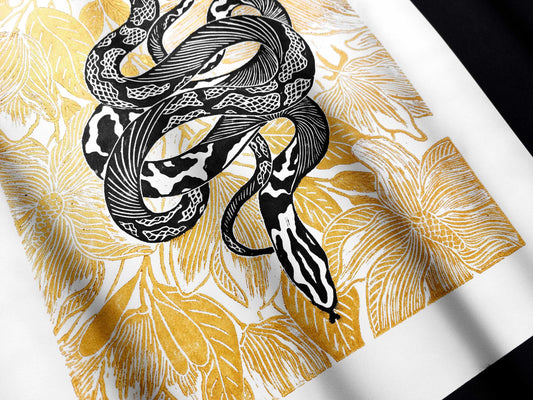 Black and gold floral snake magnolia flowers Linocut print for Nature lover gift UNFRAMED