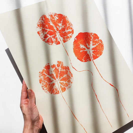 Japanese red circle leaves monotype print Modern Contemporary original artwork