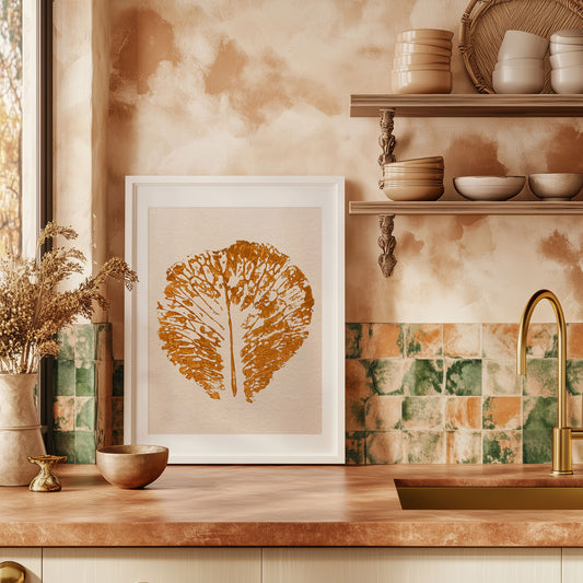 Cottagecore ochre abstract leaf monotype print for autumn kitchen wall decor