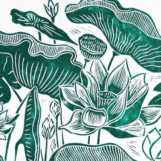 Green lotus flower Linocut print Wall hanging art decor for Nature lover gift