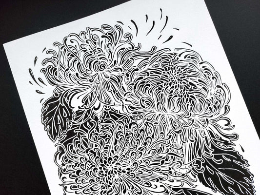 Black japanese chrysanthemum flower Linocut print for Nature lover gift UNFRAMED