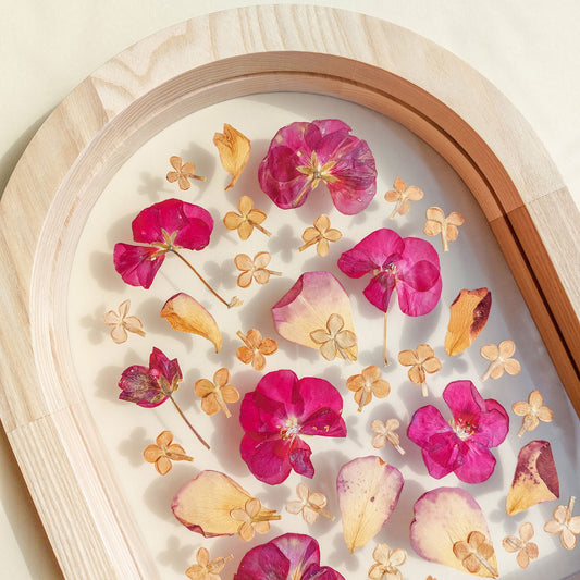 Geranium lilac pressed flower art rose petal on plexiglass with wooden arch frame for Nature lover gift