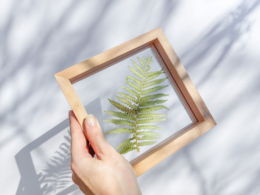 Real fern pressed leaf on plexiglass artwork with wooden square frame for Nature lover gift