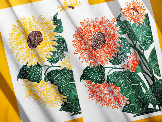 Orange and green sunflowers Linocut print for Nature lover gift UNFRAMED