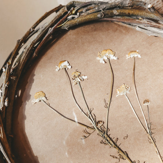 Vintage dried chamomile wildflower and plant on Craft brown paper & plexiglass Handmade vine frame Cottagecore wall hanging decor