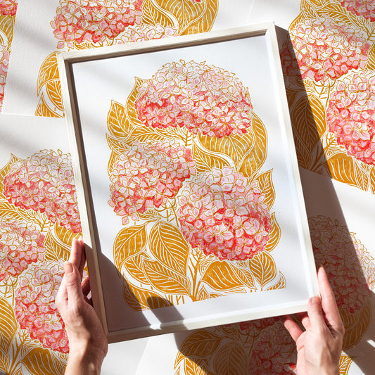 Ochre and pink watercolor hydrangea flowers Linocut print Botanical wall hanging art decor
