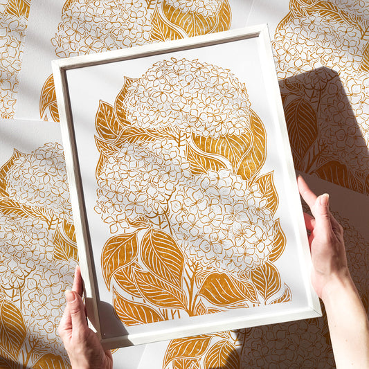 Ochre hydrangea flowers Linocut print Wall hanging art decor