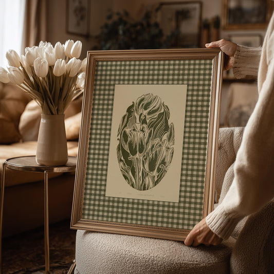 Retro cottagecore sage green Tulips flowers linocut prints Gingham printable wall art checkered decor