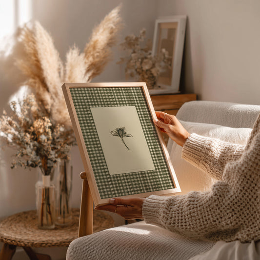 Sage green Daffodil flower linocut prints Retro cottagecore gingham printable wall art checkered decor