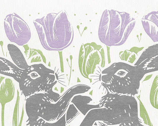 Purple and green Dancing rabbits with tulips flower and plant Printable linocut prints