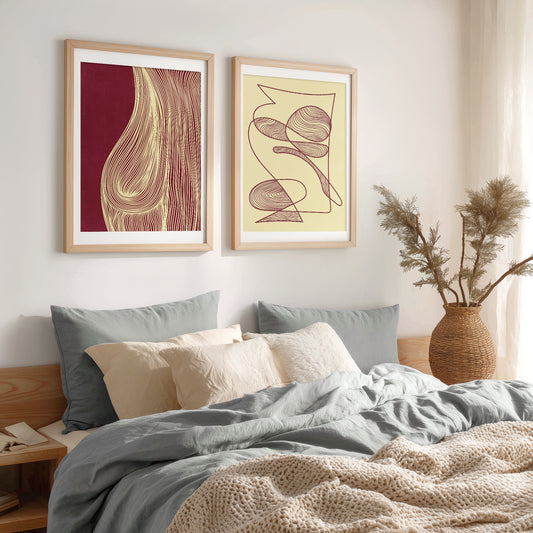 Gallery wall set of 2 trendy 2026 color palette burgundy and butter yellow abstract nature lines digital poster N6