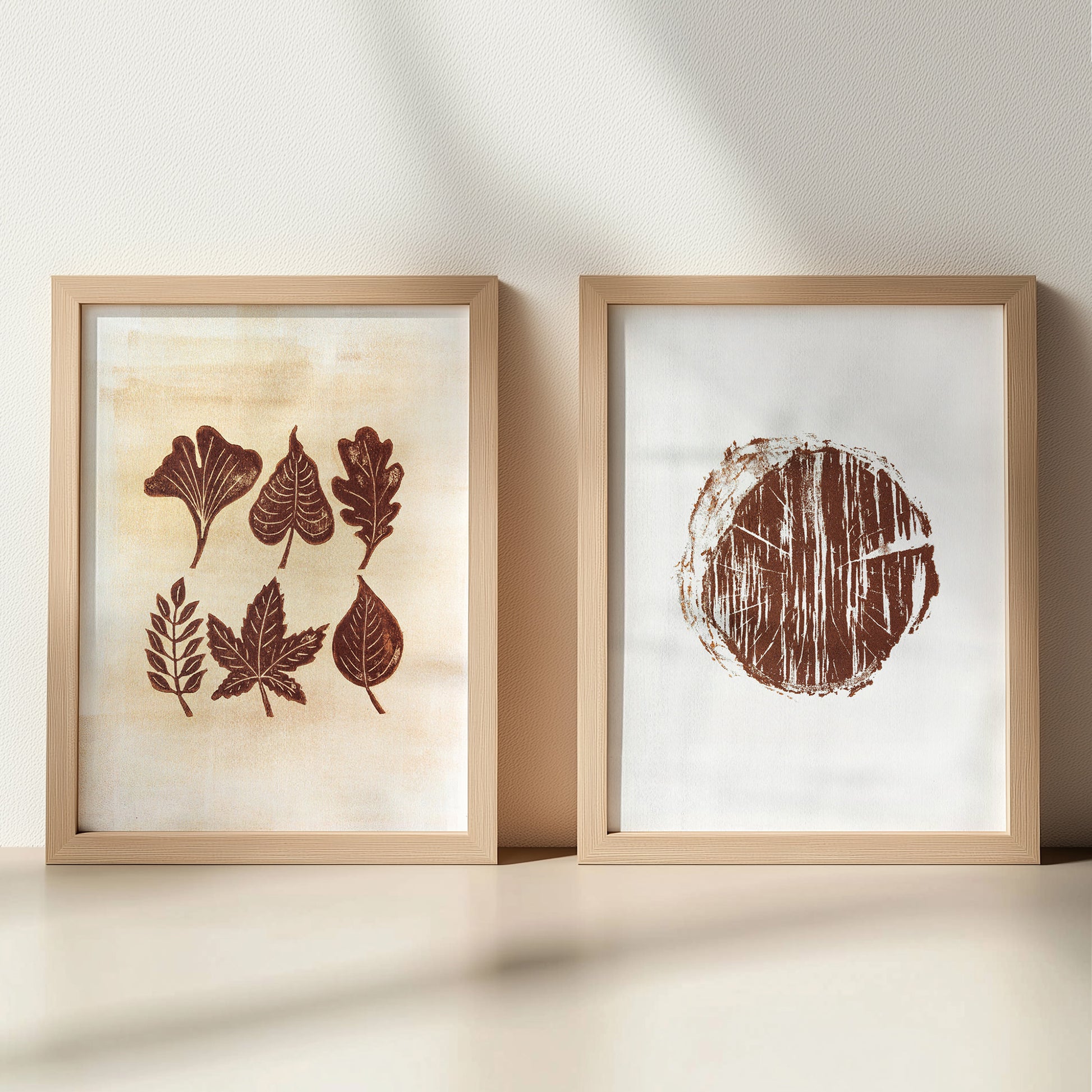 Gallery wall set of 2 autumn brown leaves and wood slice Linocut print