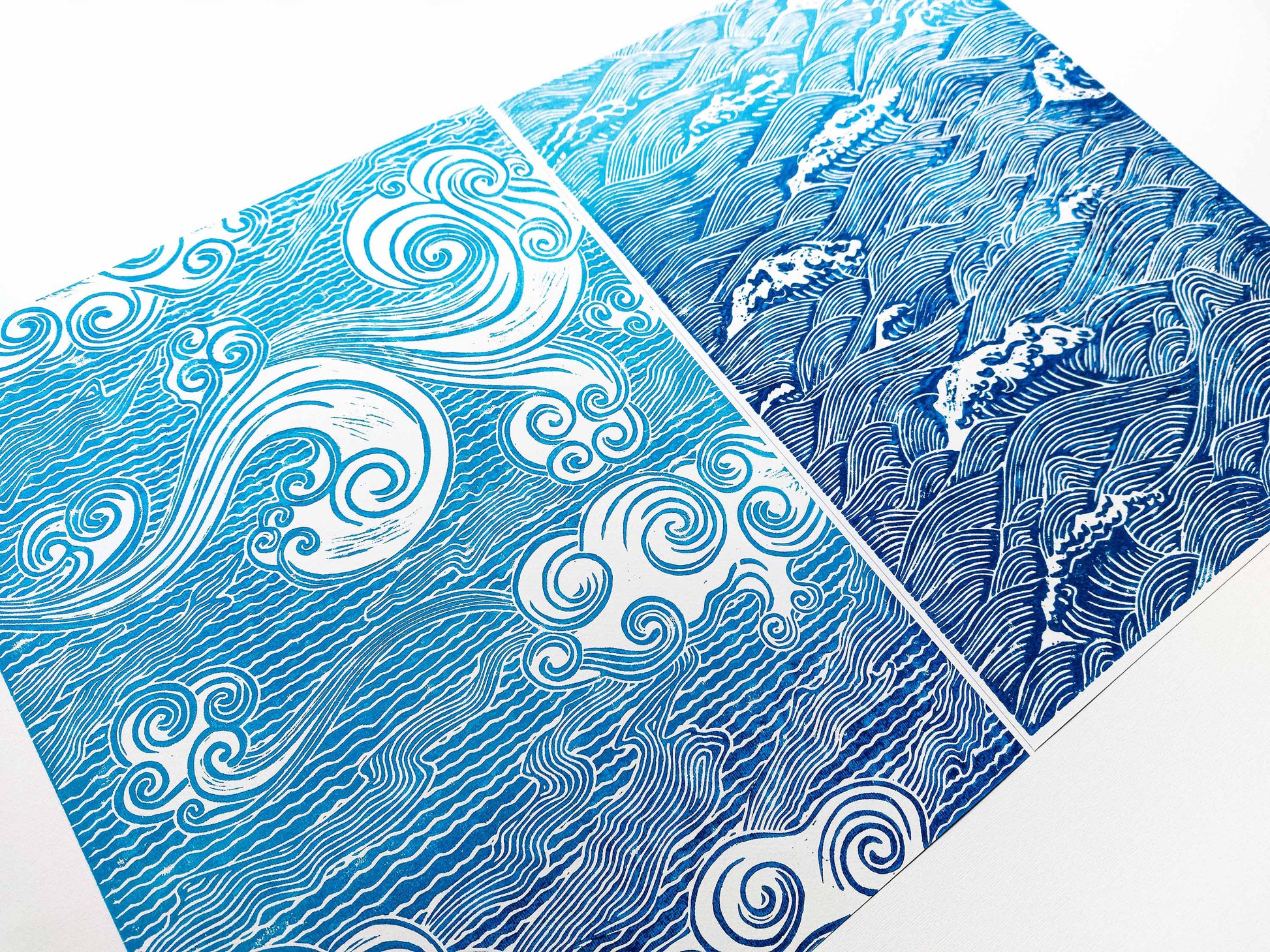 "Blue Wave" and "Japanese Clouds" Lino Prints capture the essence of both natural and cultural elements. "Blue Wave" invites you to immerse yourself in the rhythmic dance of ocean waves, while "Japanese Clouds" evokes the elegance and symbolism of traditional Japanese artistry.