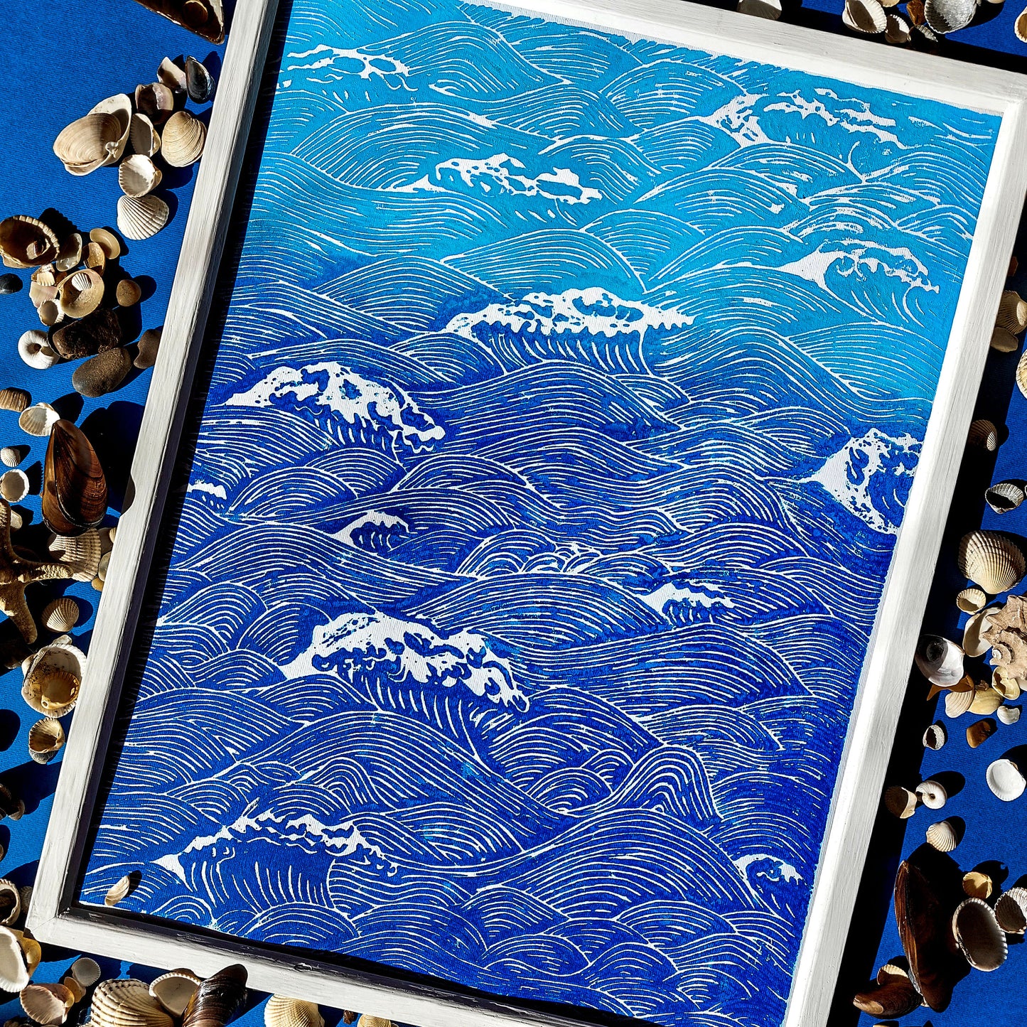 Upgrade your home decor with the Blue Ocean Waves and Sea Shell Linocut Prints and immerse yourself in their coastal charm. Let the captivating linogravure designs and soothing colors create a tranquil and inviting atmosphere in your living space.
