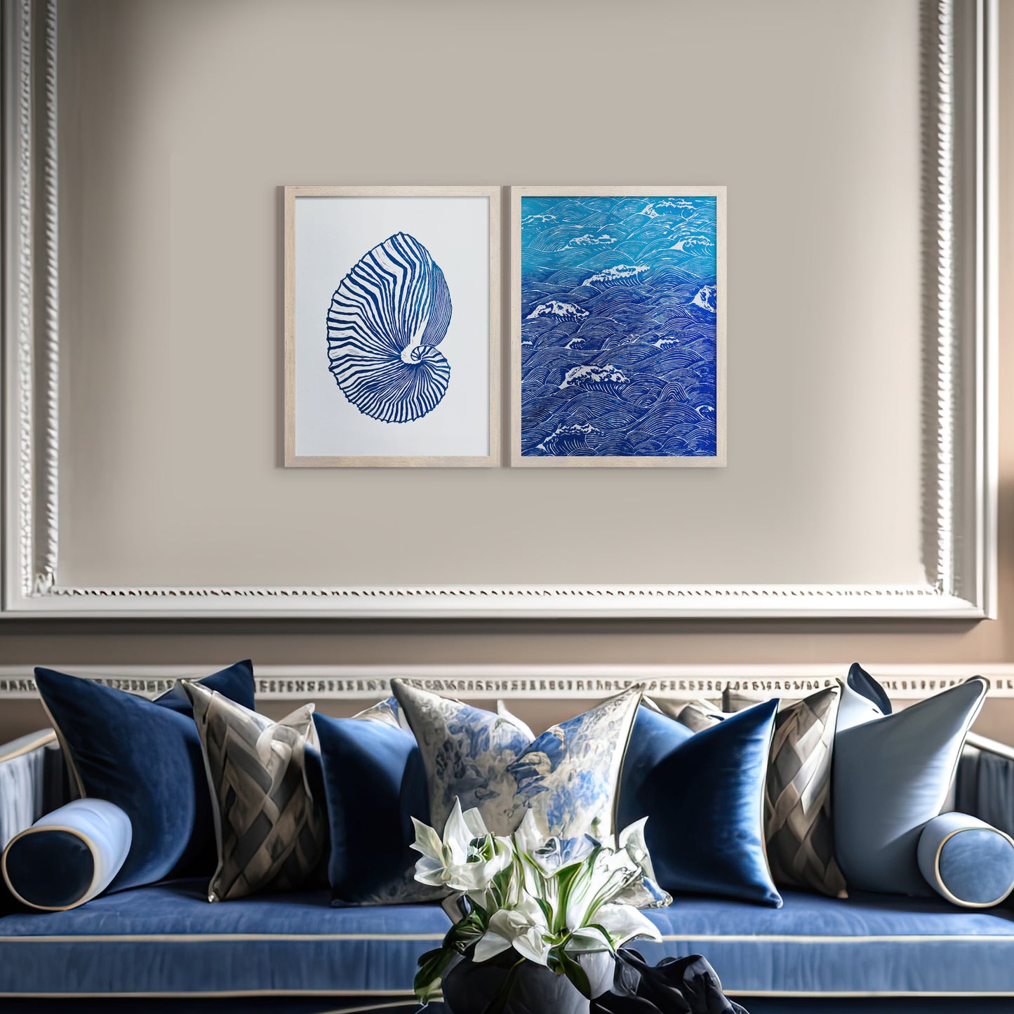 Gallery wall set of 2 Blue sea shell and ocean waves wall art Linocut print UNFRAMED