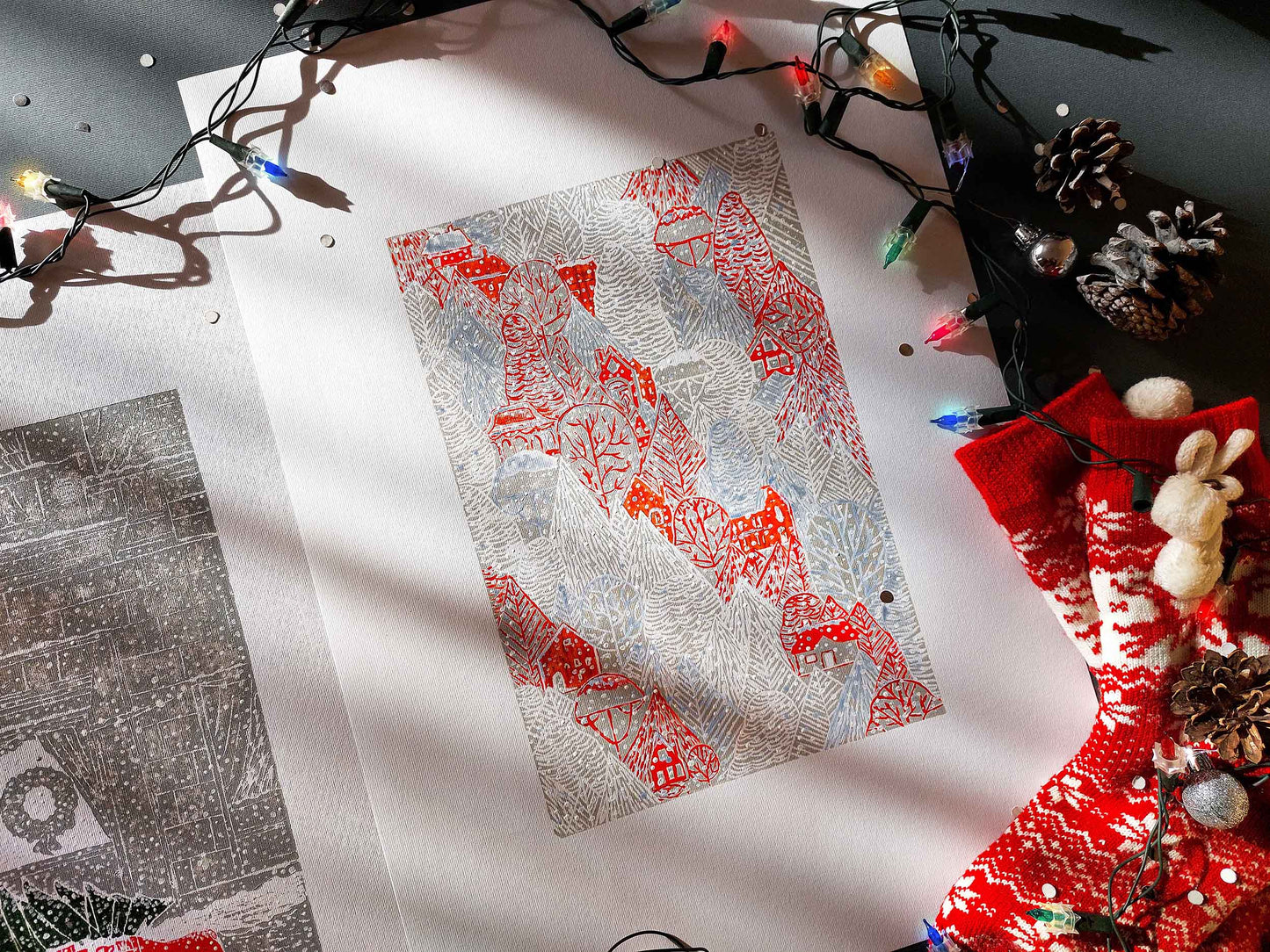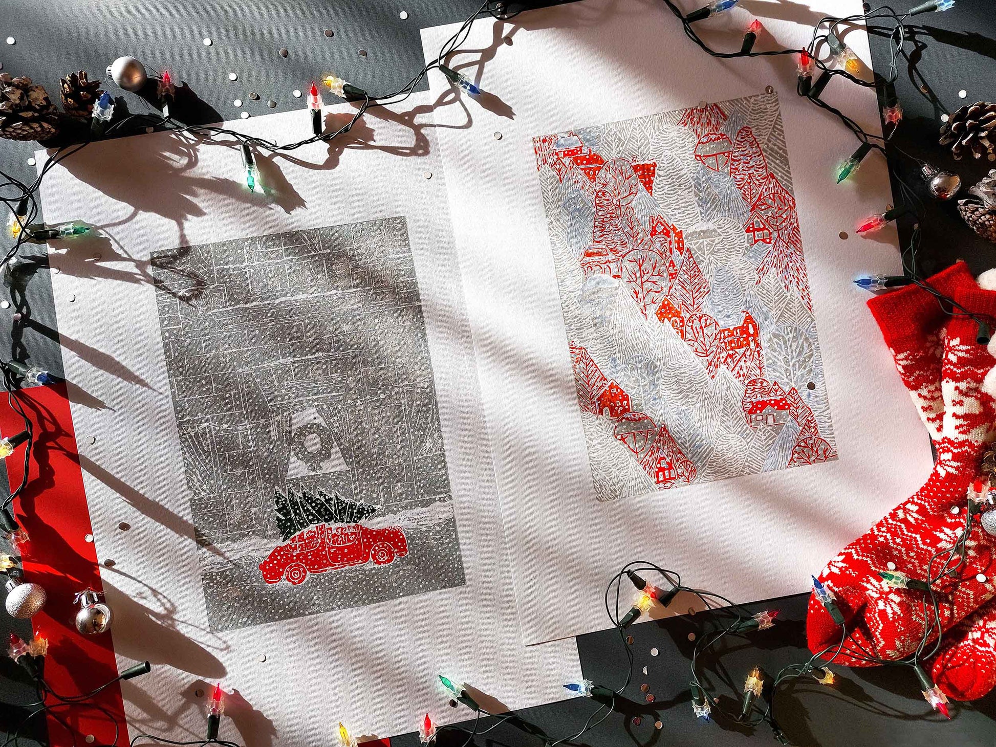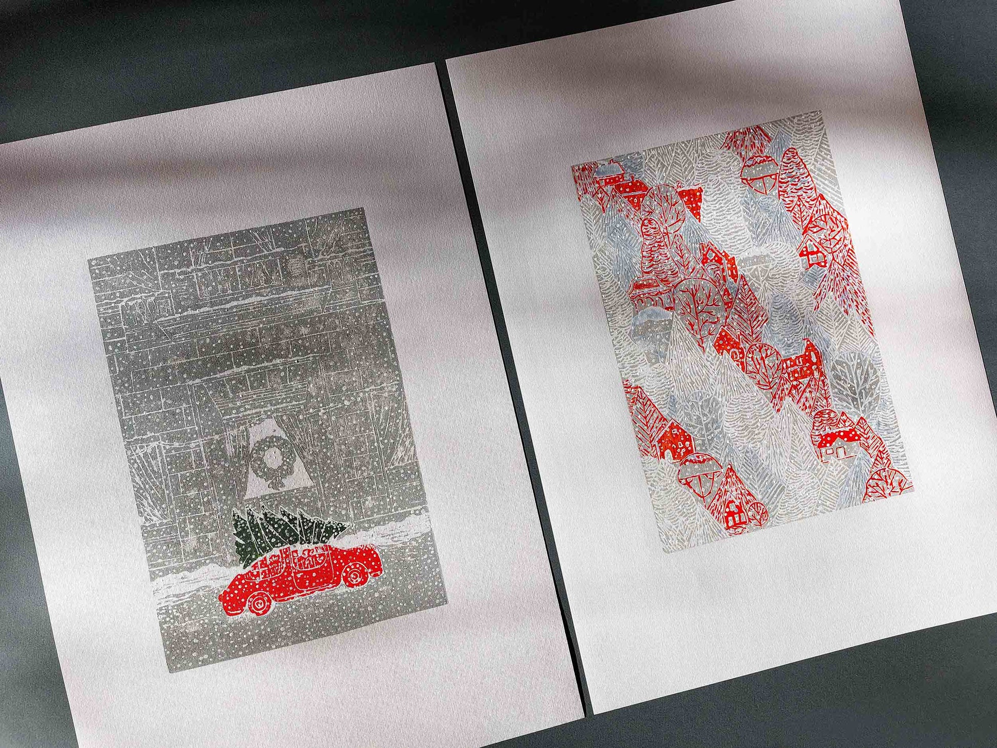 The combination of these two relief prints is like a visual symphony of holiday delight. One celebrates the Christmas tree and car, a symbol of holiday togetherness, and the other invites you into a tranquil winter scene, where red houses stand in contrast to a pristine, snowy landscape. Whether you want to reminisce about Christmases past or celebrate the beauty of winter, these handmade prints are the perfect addition to your seasonal decor.