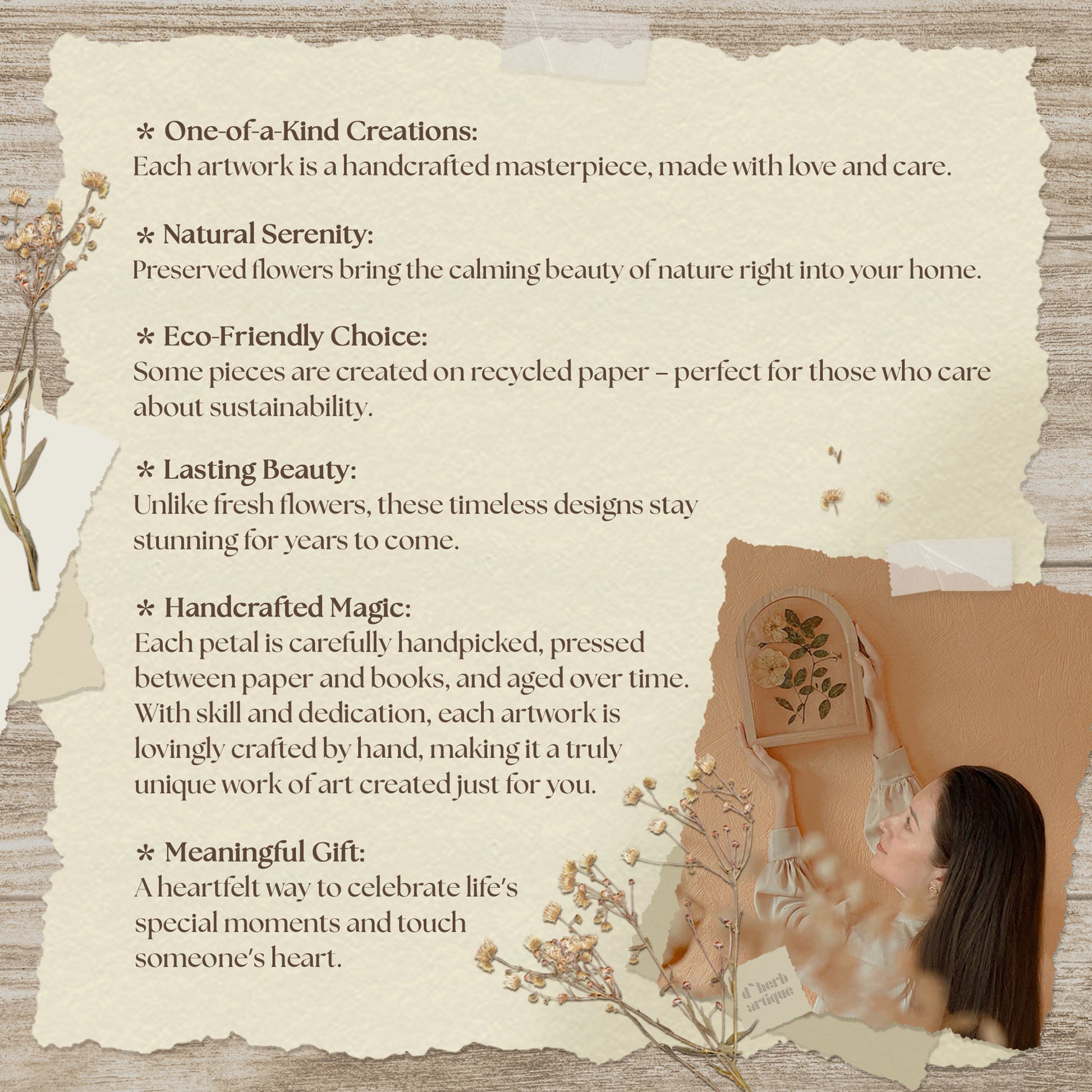 Once the flowers are fully dried and preserved, a world of creativity unfolds. With a skilled hand and an artist's eye, I arrange the pressed flowers into stunning compositions. Each artwork I create is a unique piece, carefully crafted with meticulous attention to detail and an appreciation for the natural beauty of the flowers.