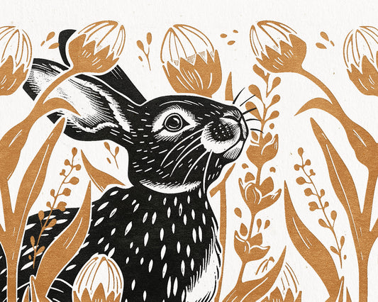 Ochre and black Bunny with tulips and plant Printable linocut prints