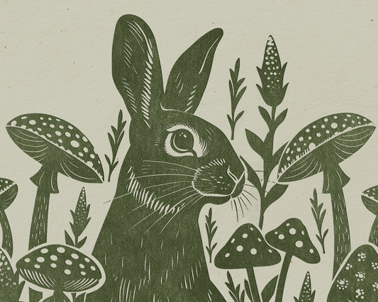 Printable linocut prints Sage green rabbit with mushroom and plant wall poster art