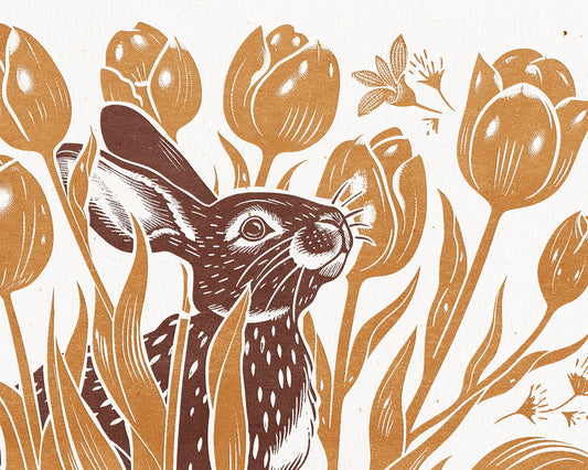 Ochre brown Hare with tulips and plant Printable linocut prints