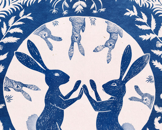Kids dark blue dancing rabbits with floral and plant texture Printable linocut prints