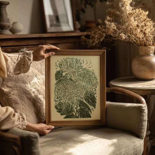 Vintage cottagecore Chrysanthemum flowers sage green linocut print