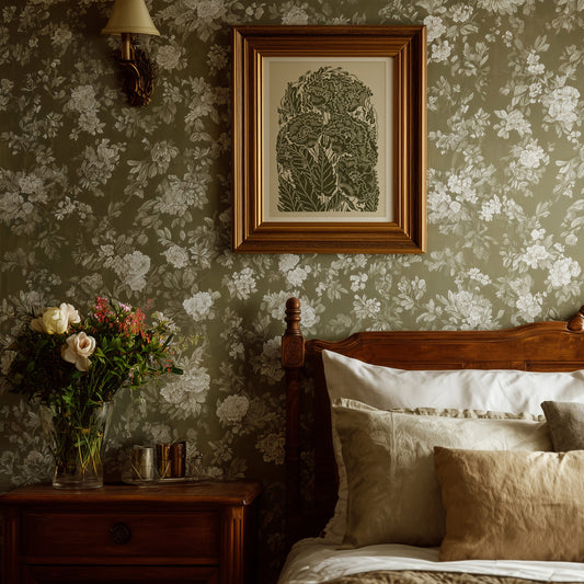 Vintage cottagecore Chrysanthemum flowers sage green linocut print