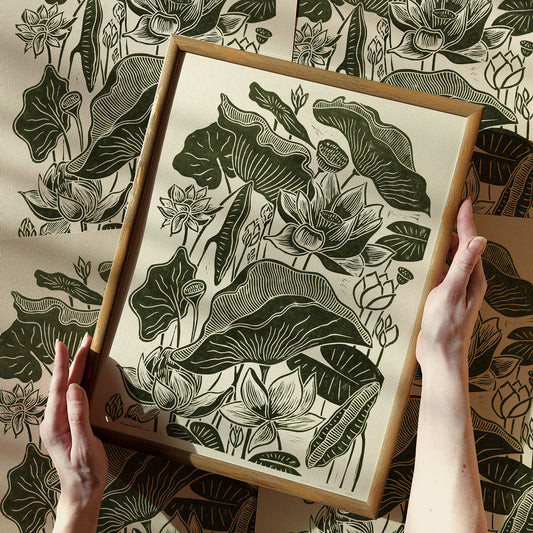 Vintage cottagecore Lotus flowers sage green linocut print wall art decor