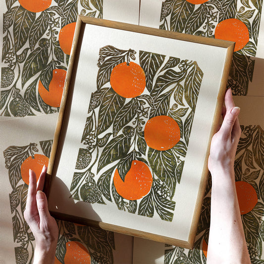 Retro oranges citrus fruit Large linocut print Cottagecore kitchen wall art decor