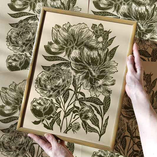 Vintage cottagecore Peony flowers sage green linocut print wall art decor