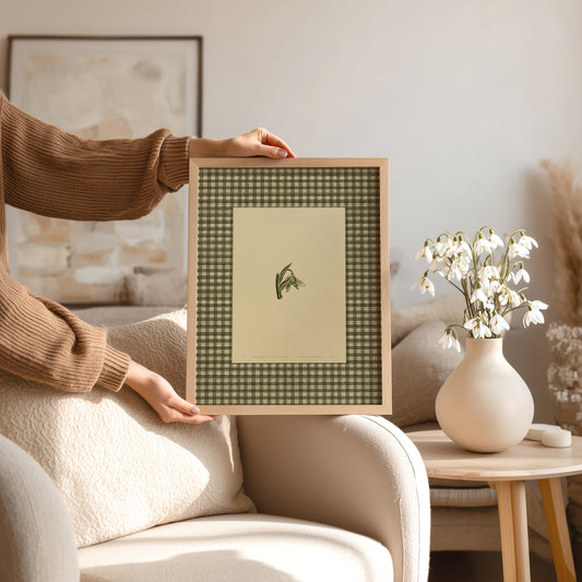 Sage green snowdrop flower linocut prints Retro cottagecore gingham printable wall art checkered decor