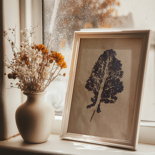 Cottagecore autumn brown craft leaf monotype print for farmhouse bedroom wall art decor