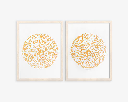 Gallery wall set of 2 Beige minimalist abstract circle flower Autumn wall art Linocut print for Nature lover gift UNFRAMED