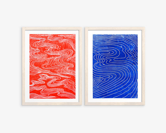 Gallery wall set of 2 Japanese abstract red clouds and blue sea wall art Linocut print UNFRAMED