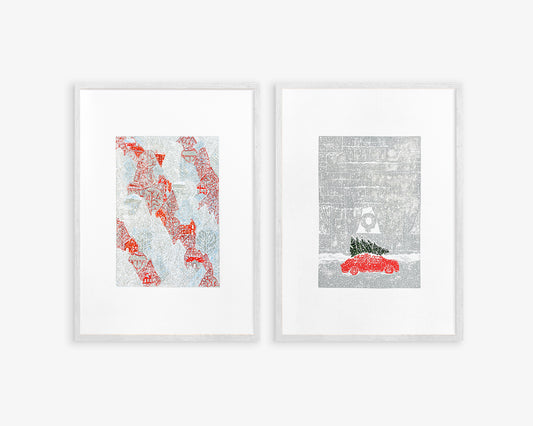 Gallery wall set of 2 Christmas tree with car art and Winter forest with red houses and white snow Linocut print UNFRAMED