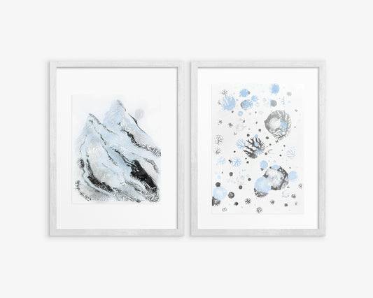 Abstract light blue snow Silver relief texture Gallery wall set of 2 Monotype prints Original artwork for New home gift