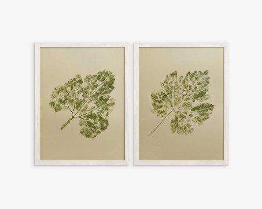 Gallery wall set of 2 Green vintage textured leaves N2 Monotype print wall art