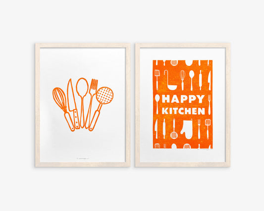 Orange utensils pattern and Happy kitchen sign Gallery wall set of 2 Linocut print for Modern kitchen art UNFRAMED