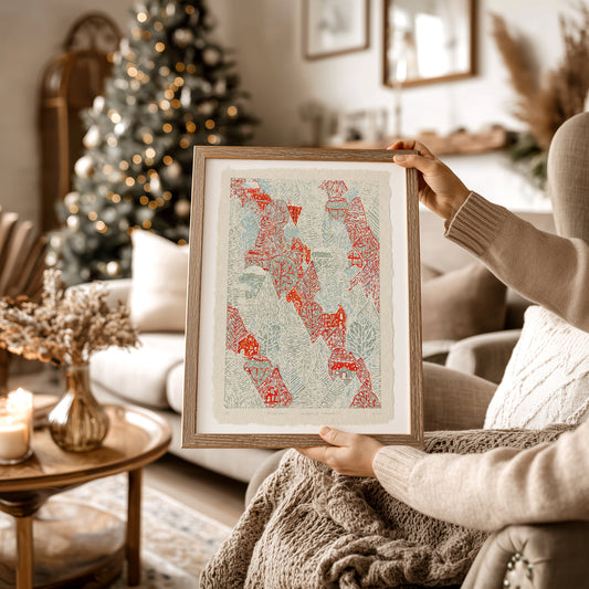 Printable First snow to autumn forest with red houses linocut prints for Christmas wall art decor poster
