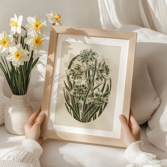 Vintage daffodil flowers linocut print wall art decor