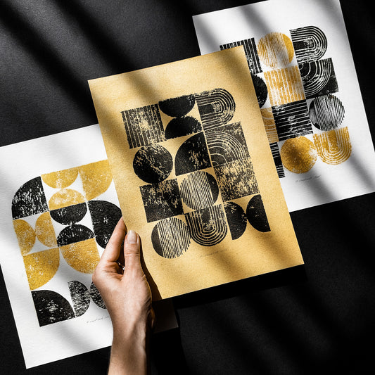 Mid century modern gold bauhaus linocut print Gallery wall set of 3 original artworks