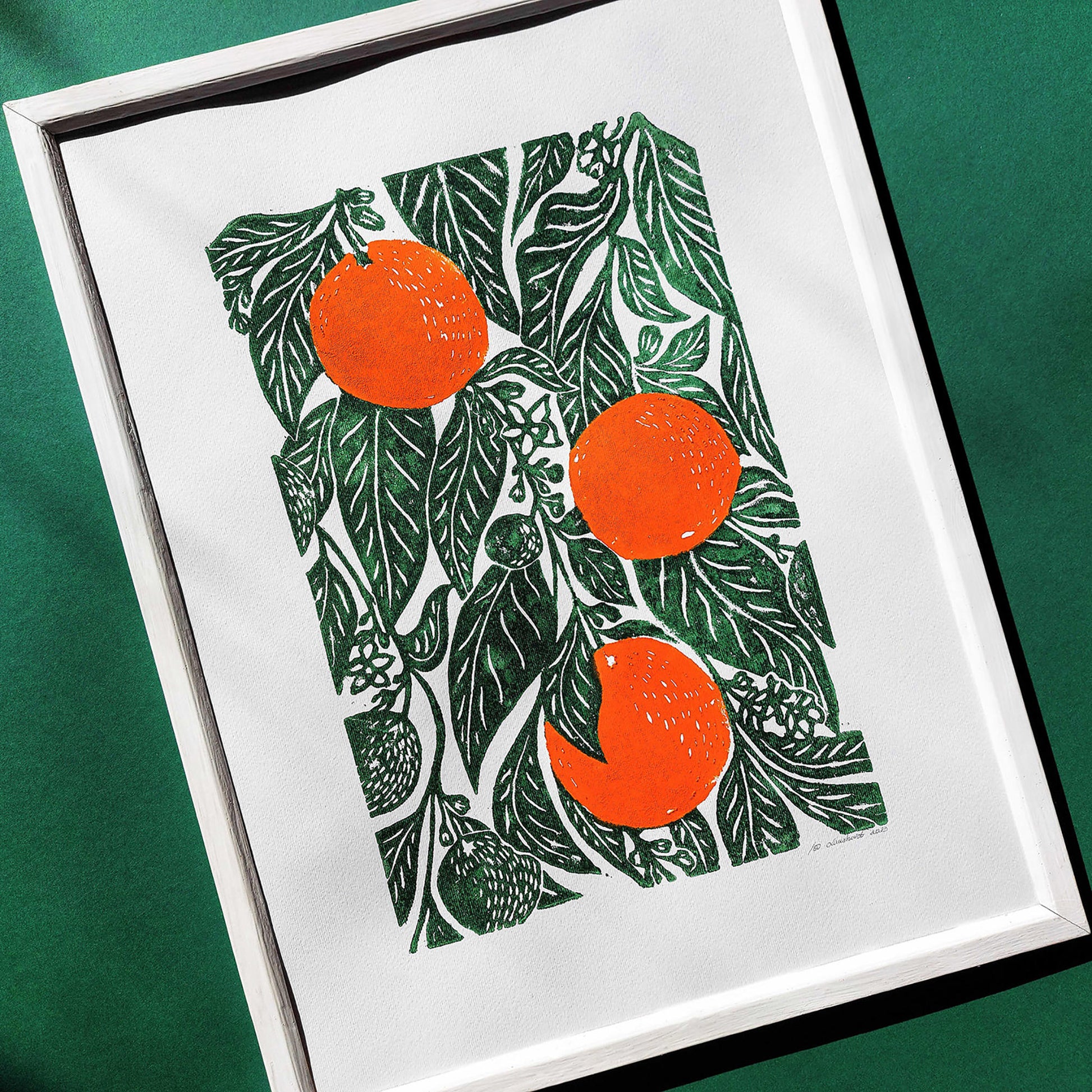 Ліногравюра з апельсинами / Оригінальний твір мистецтва Ботанічні фрукти для сучасної кухні або подарунок любителю природи БЕЗ РАМКИ