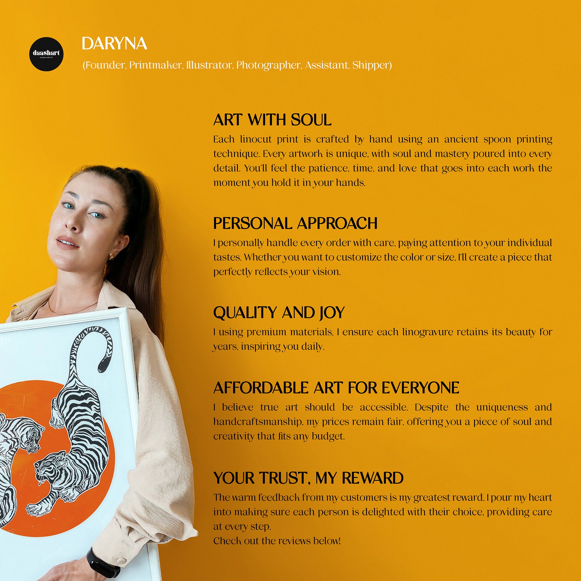 Оскільки я друкую всі свої речі індивідуально, можуть бути дуже невеликі варіації друку, але саме це робить їх оригінальними та індивідуальними! Кожна ліногравюра є оригінальним твором мистецтва, а не цифровим відтворенням. На всіх принтах також є мій оригінальний підпис художника.