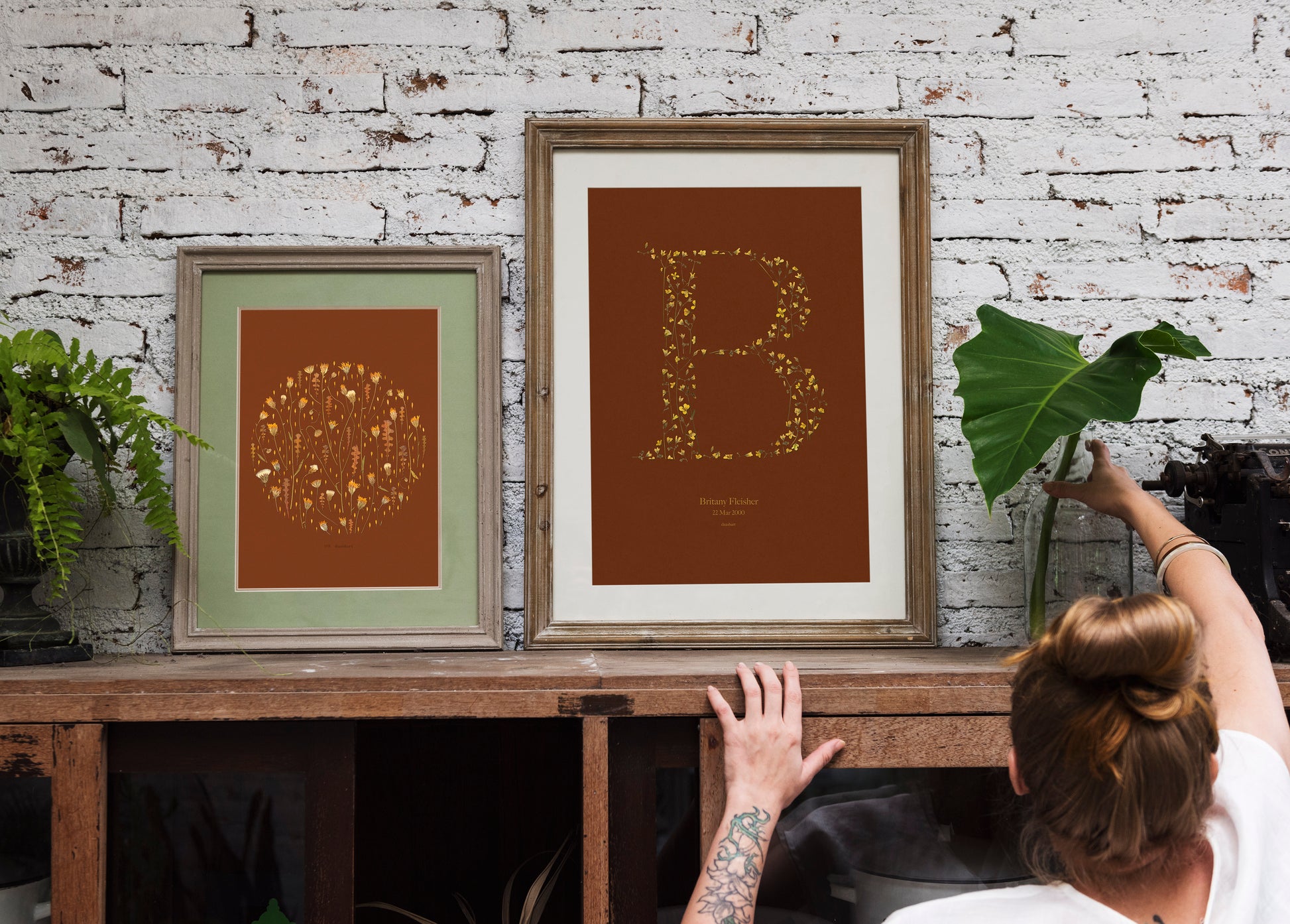 Terracotta personalized name letter prints Pressed yellow wildflowers poster